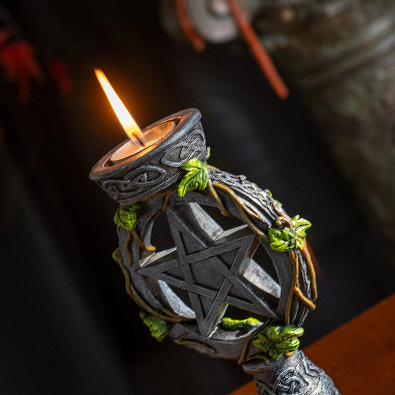 Ce bougeoir pentagramme est une pièce profondément symbolique, inspirée des traditions païennes et spirituelles. Le pentagramme, entouré de feuilles et de branches délicatement sculptées, incarne l’équilibre des éléments, la protection et la connexion à la nature.