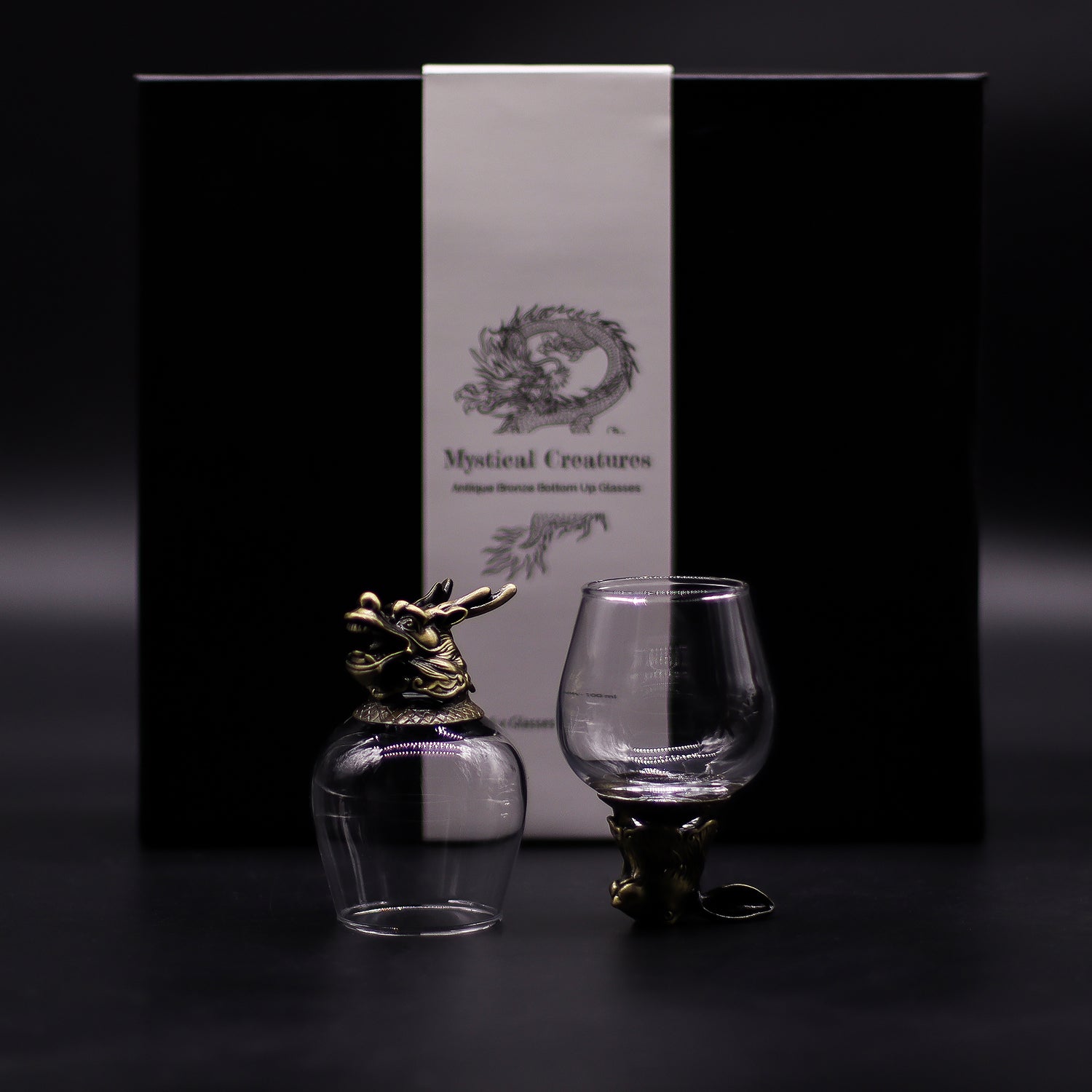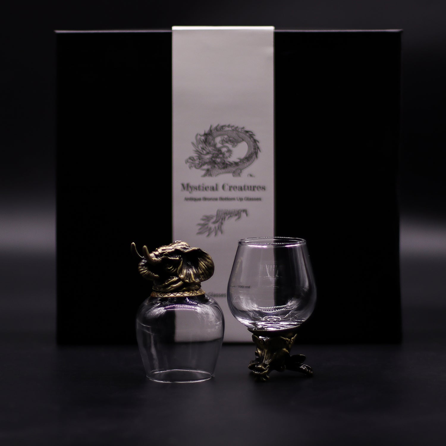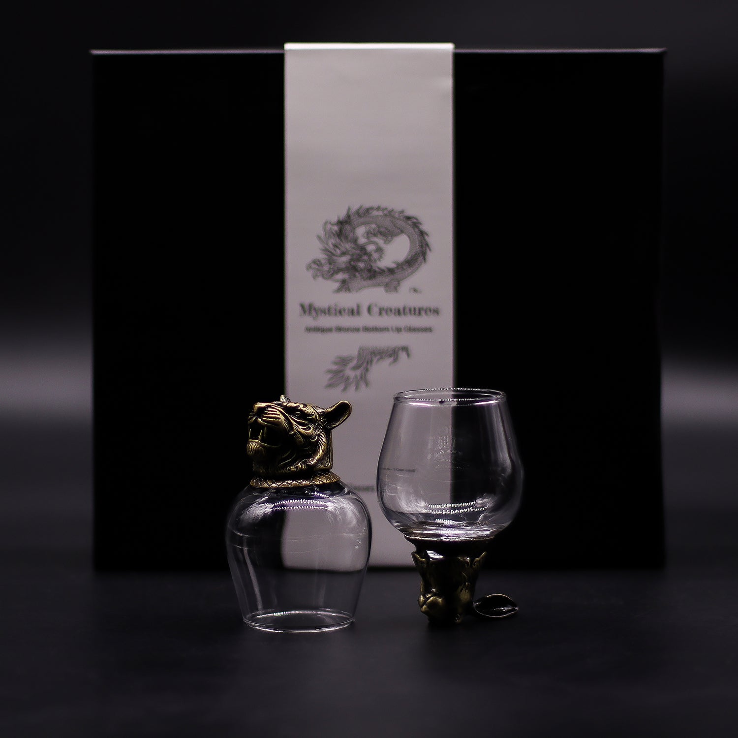 Chaque verre possède une base en laiton massif sculptée en créatures mythiques telles que le dragon, le cobra, le tigre, l’éléphant, le lapin et le bélier — finement détaillées et pleines de caractère. Lorsqu’on les retourne, la figurine se révèle dans toute sa splendeur, transformant chaque verre en petite œuvre d’art.