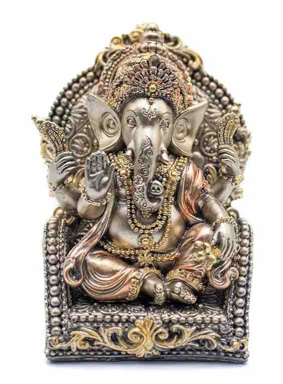 Magnifique Ganesh assis sur son trône, richement orné d’or et d’argent, symbole d’opulence et de protection. Il attire la chance et la réussite tout en purifiant les énergies autour de vous.