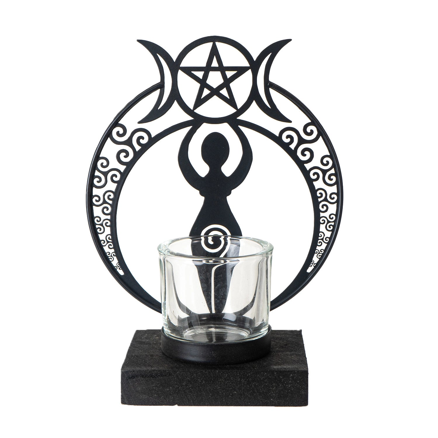 Conçu en métal enduit de poudre avec une base en bois stable, il accueille un petit photophore en verre pour diffuser une lumière douce, parfaite pour une ambiance rituelle, méditative ou simplement chaleureuse à la maison.