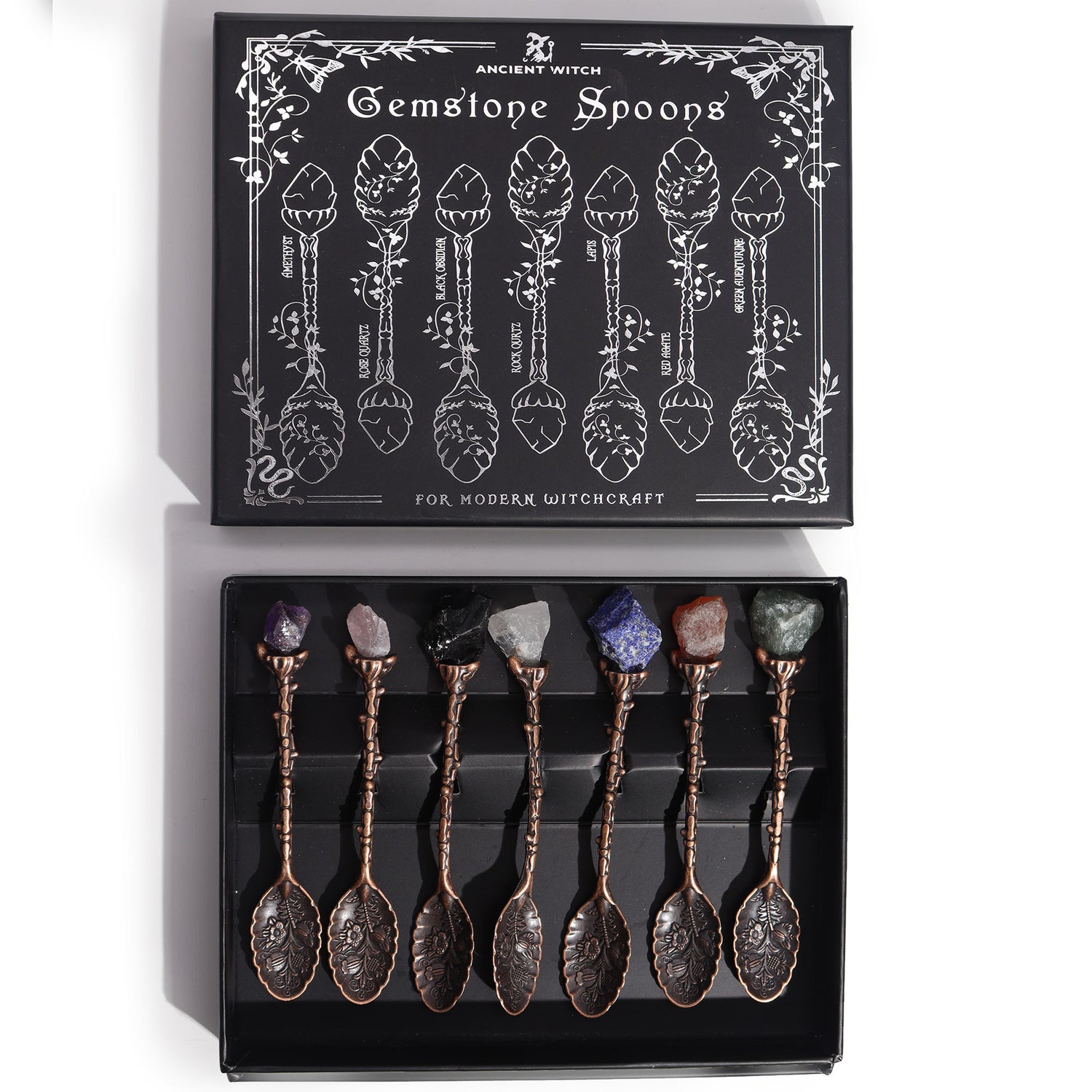 Cet ensemble exclusif de 7 cuillères de sorcière en pierres précieuses est une véritable œuvre d'art, combinant l'éclat argenté foncé et les puissantes énergies spirituelles des pierres naturelles.