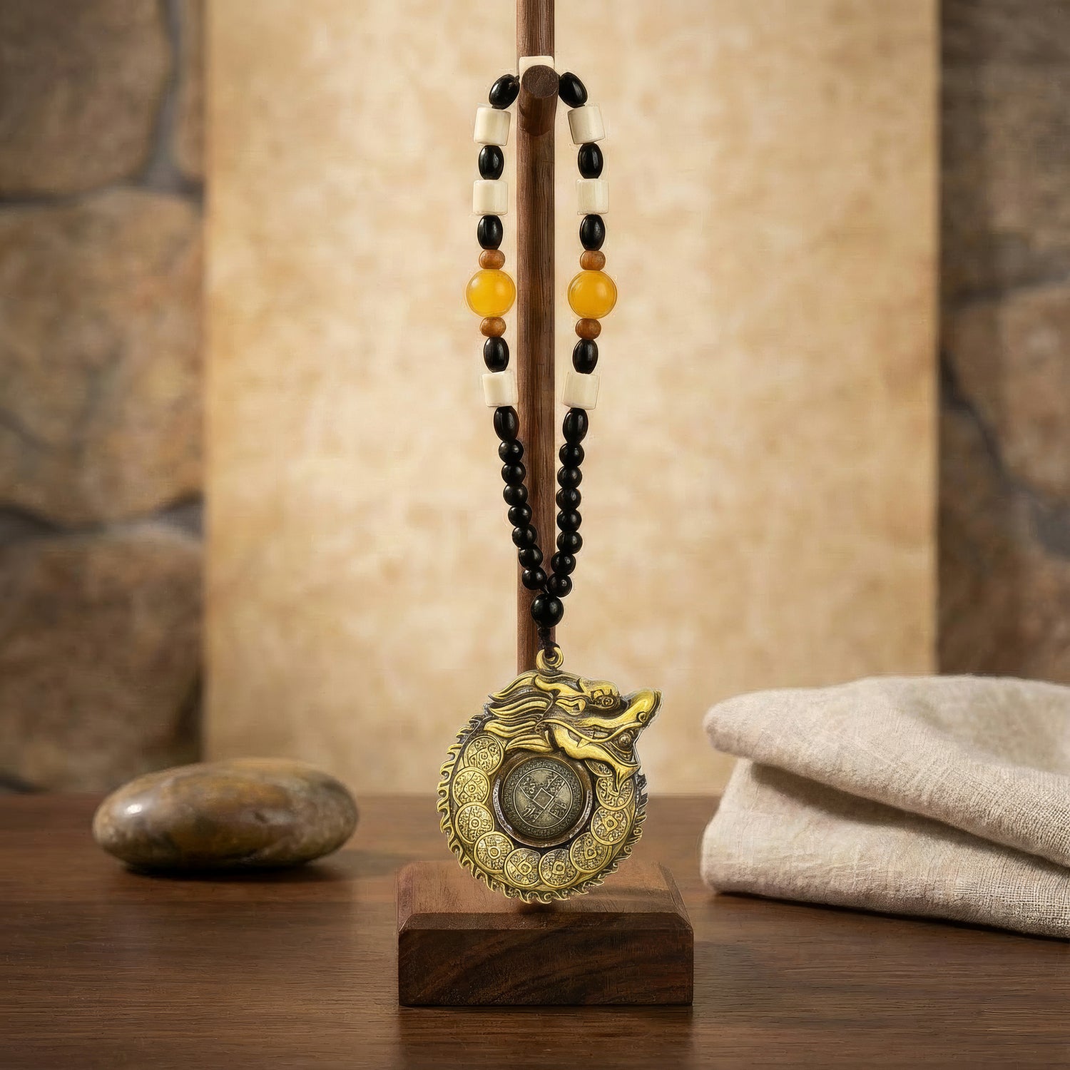 Fabriquée en laiton massif avec une finition antique détaillée, la pièce combine présence visuelle et poids symbolique. La forme fluide du dragon et les motifs de pièces environnantes ajoutent mouvement et profondeur, tandis que les caractères chinois stylisés servent symboliquement de bénédictions pour la fortune et le succès. Suspendue à un cordon décoratif de perles noir, crème, ambre et bois, elle se place traditionnellement dans les bureaux, commerces, près des entrées, bureaux ou zones de richesse et de carrière.