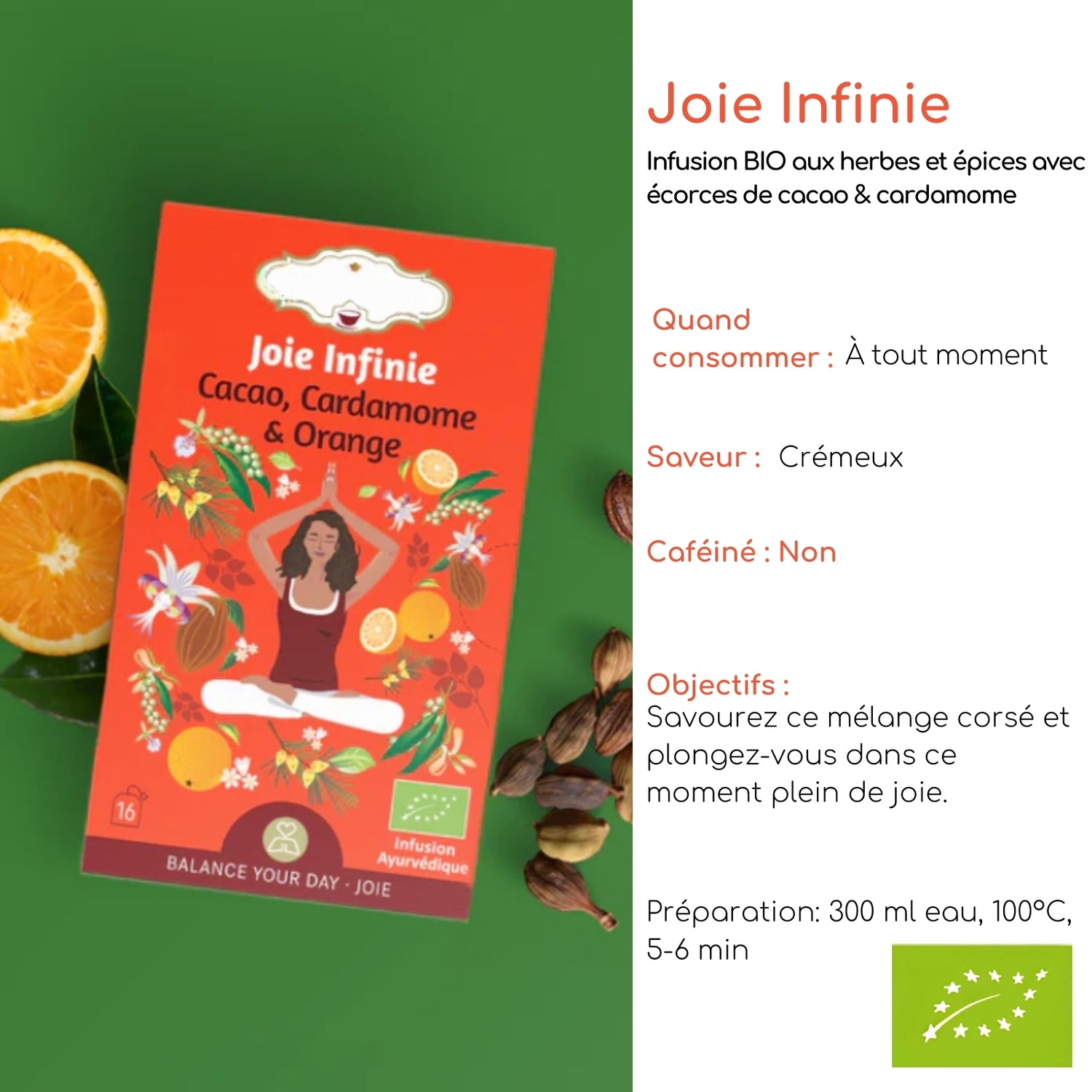 "Joie Infinie" est une tisane bio délicieusement crémeuse qui marie la richesse du cacao à l’arôme parfumé de la cardamome et à la fraîcheur du zeste d’orange.