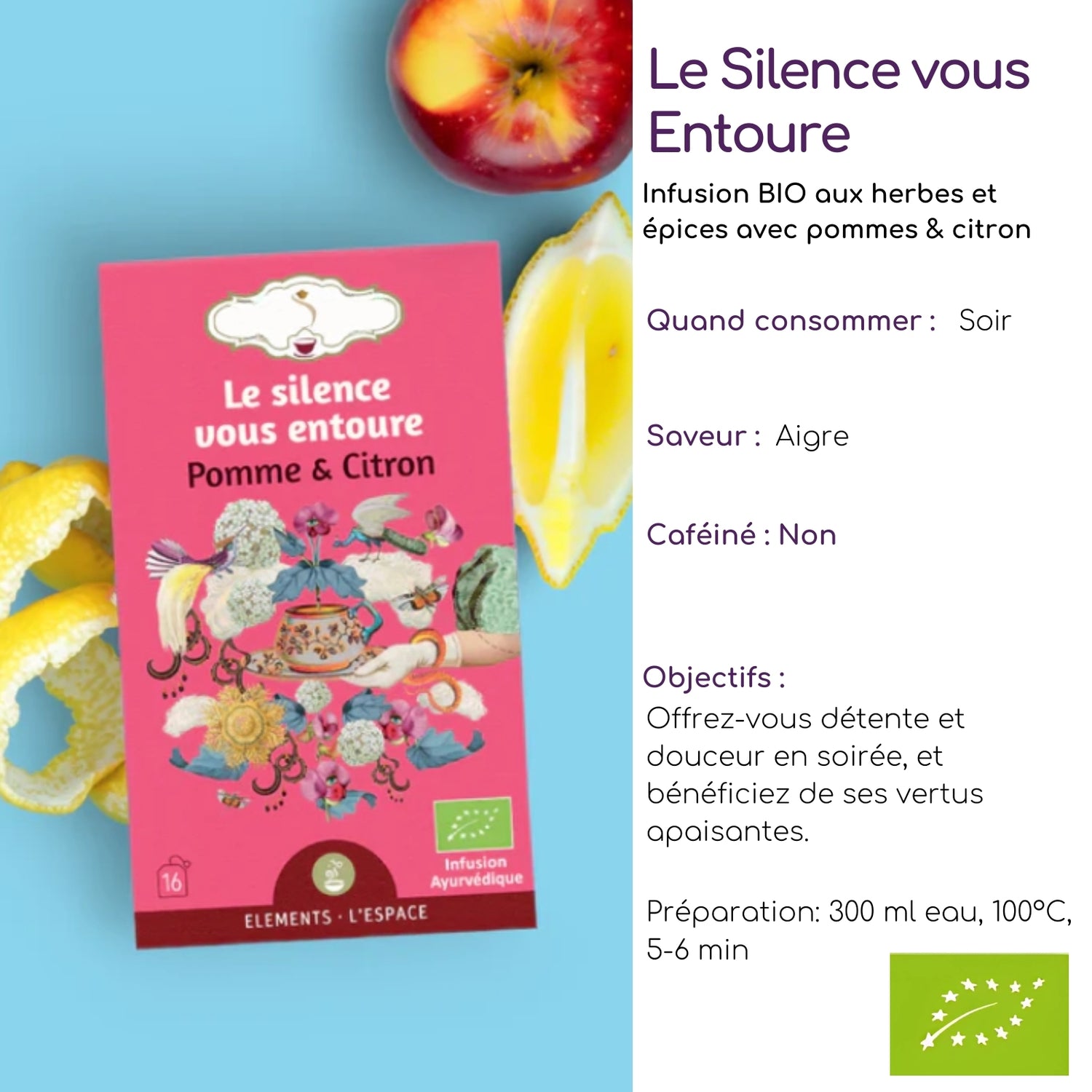 "Le Silence vous entoure" est une tisane bio conçue pour apaiser l'esprit et favoriser un moment de sérénité.