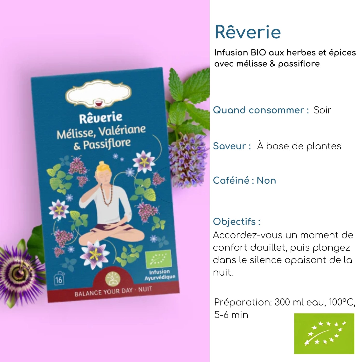La tisane bio "Rêverie" est spécialement formulée pour vous accompagner dans un moment de calme et de sérénité, idéale à savourer en fin de journée.