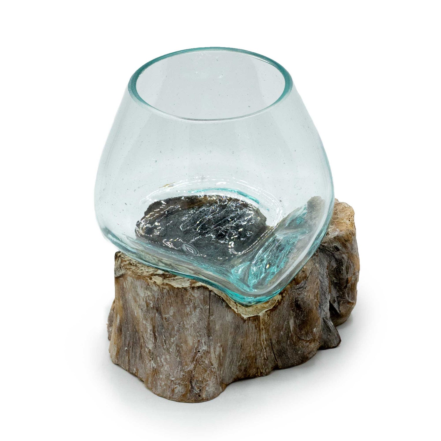 Chaque article est unique, car il est fabriqué à partir de bois Gamal naturel et durable et le verre recyclé est façonné pour s'adapter à ce qui ajoute à son authenticité. Ils peuvent être utilisés pour les plantes d'intérieur, les jardins zen ou les bougies flottantes.