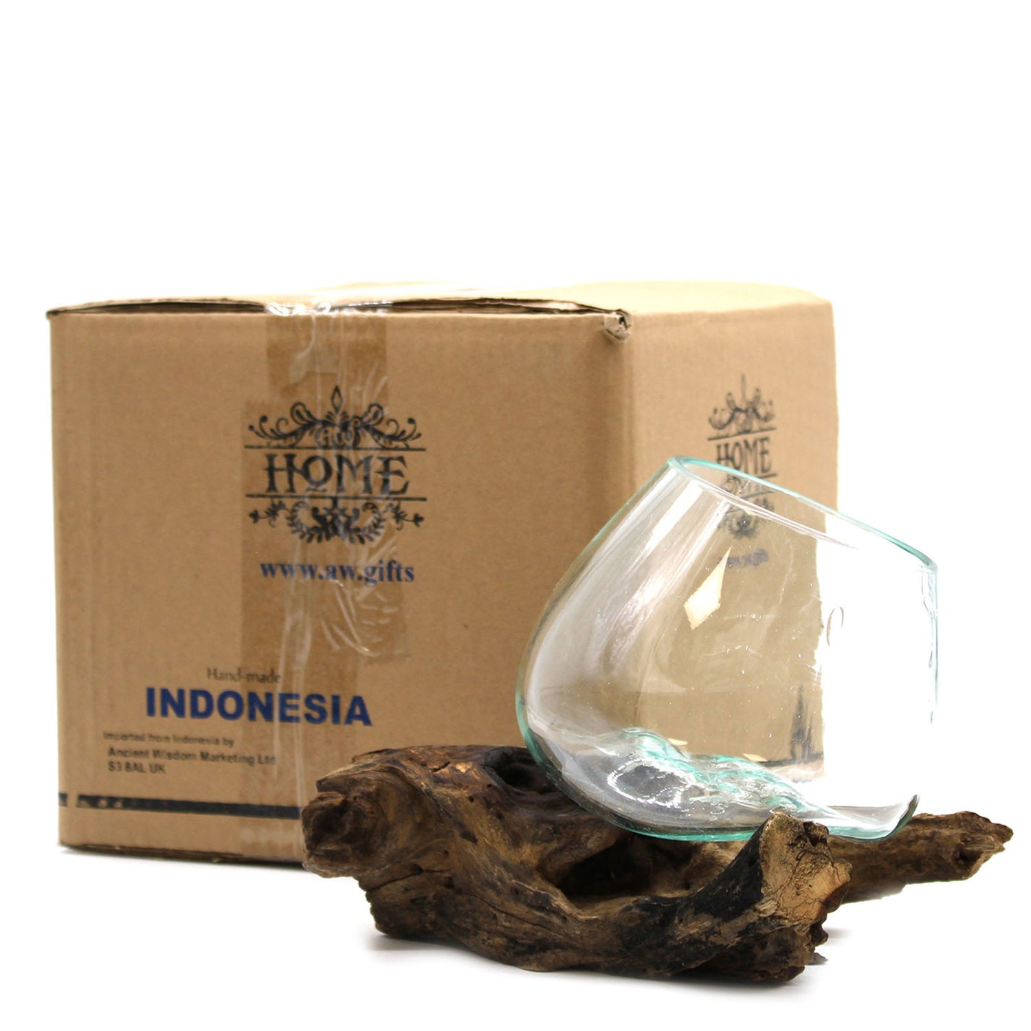 Le verre est soufflé à la bouche et alors qu'il est encore chaud, il est ensuite détendu sur un morceau de racine de Gamal, le verre durcit ensuite à la forme du bois assurant un ajustement parfait. Ils sont fabriqués à partir d'un produit naturel en utilisant des outils à main de la manière traditionnelle balinaise. Il offre un cadre unique pour les pierres et les plantes aériennes, les fleurs coupées, un aquarium ou une carafe à vin.